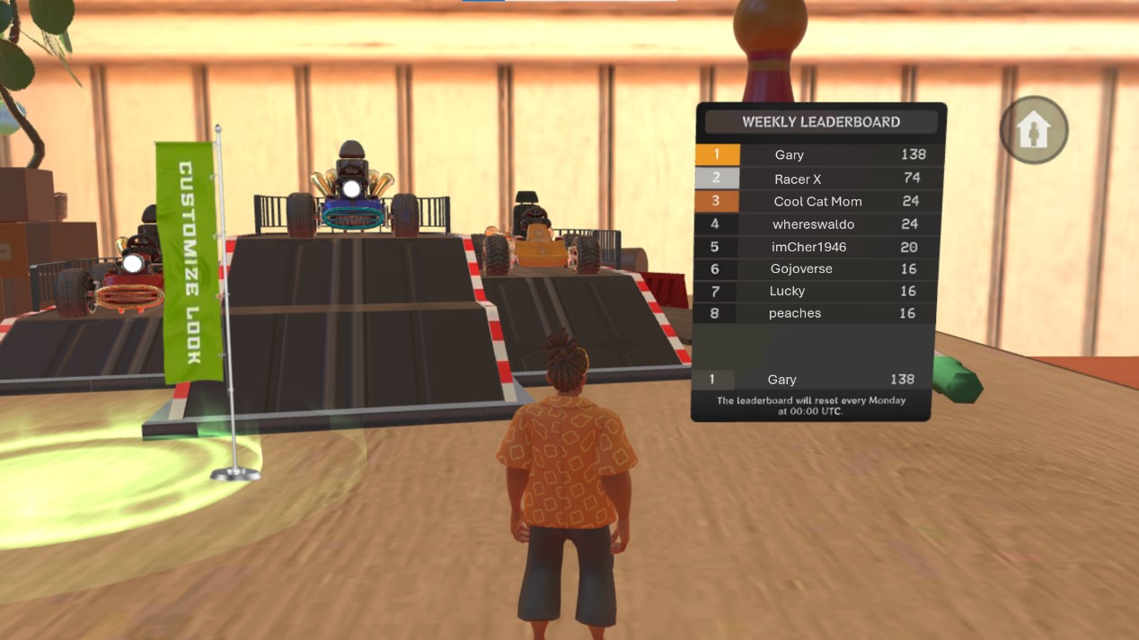 A player’s score is determined by their placement at the end of each race. With five players, the one who gets first place receives 30 points, second place gets 24, while those in third, fourth, and fifth places, get 20, 16, and 12, respectively. Each player’s score shown on the leaderboard is the total number of points they’ve accumulated throughout the week. Every time a player switches rooms, they will still get to carry over all the points they’ve collected in other rooms.